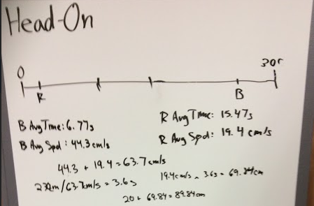 Today was Dueling Buggies! I’ve been emphasizing position vs. time graphs, so I wasn’t surprised that a lot of students went that direction. There were a lot of other interesting solutions, though. One of my favorites was a group who added the speeds of the two buggies, then divided the initial distance between the buggies by the combined speed to get the collision time, which allowed them to find the position. I was pleased to see that students were intrigued by the variety of solutions, and several wanted to talk to groups who’d done things differently after they turned in their whiteboards. Students also readily recognized that every group had a useful approach since every group made an accurate prediction.