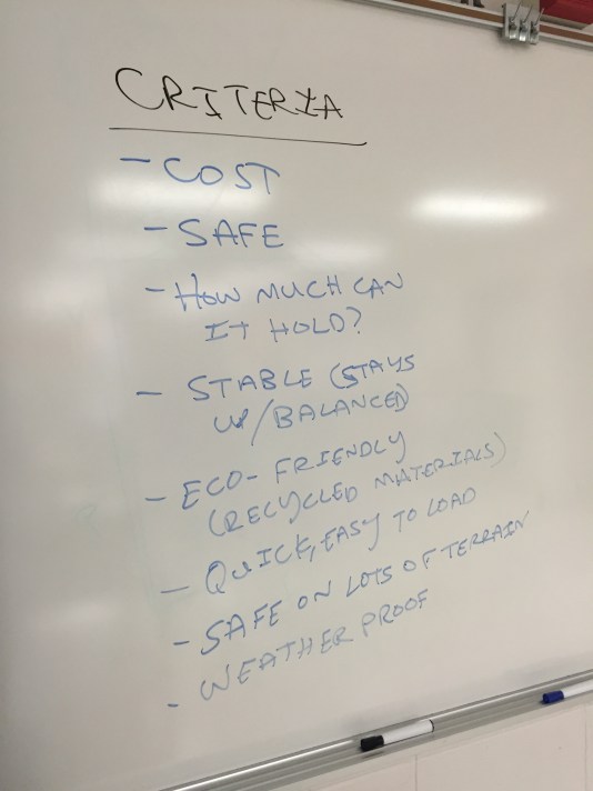 We teach forces using a project-based unit centered on an engineering desig challenge. Today, I introduced the challenge: students must make a cargo carrier that attaches to a truck will keep an egg intact in a head on collision. We spent some time today brainstorming what the customer may be interested in and what kind of background knowledge will be necessary for the task.