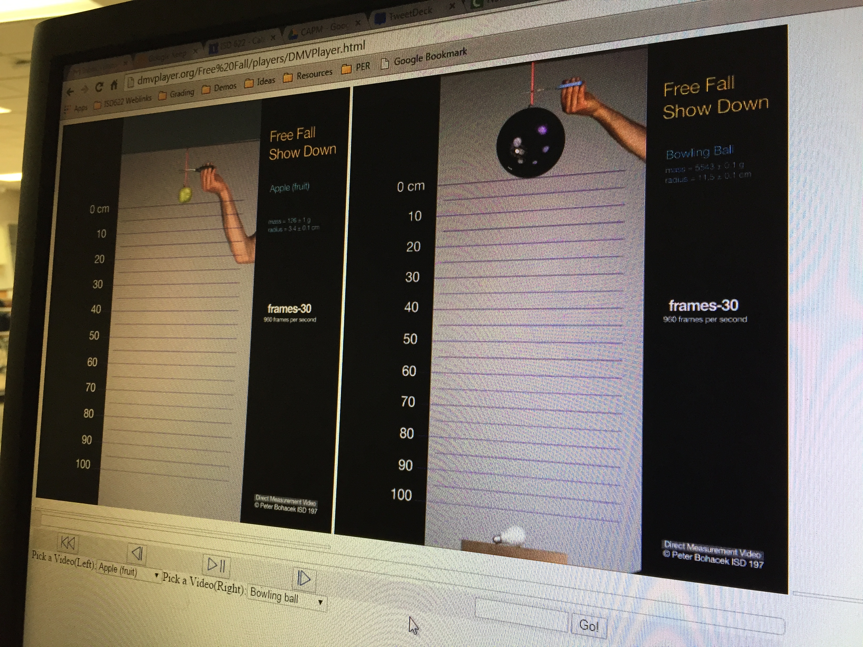 We went to the computer lab for students to use a Direct Measurement Video to begin exploring free fall. This one allows students to watch side by side high speed videos of a variety of objects in free fall. I asked students to find a value for the acceleration of a falling object and to identify any variables that affects that acceleration. While many students were quick to dismiss small differences in the time, one group had a great discussion. They saw that the bowling ball fell noticeably faster than a ping pong ball, so they not surprisingly decided that weight must matter. One person wasn’t satisfied; he played the video of a large steel ball side by side with a small steel ball to show they fell at the same rate in spite of different masses and radii. With some nudging, they were able to agree that density must be the key factor.