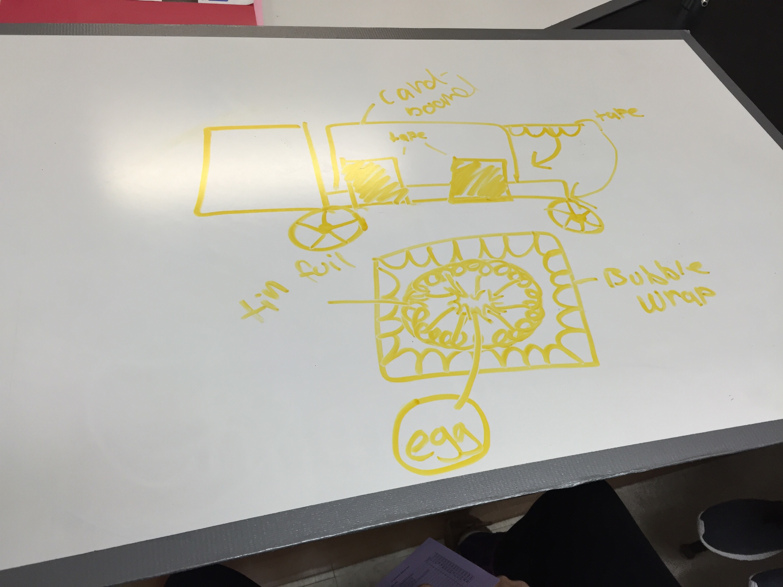 Now that students have a basic knowledge of Newton’s 1st and 2nd Laws, they went to the drawing board to develop ideas for a design challenge where they’ll need to keep an egg safe in a head-on collision. Students had to include a justification, based on Newton’s Laws, for why they think their design will work, which lead to some good debate and physics talk within groups.