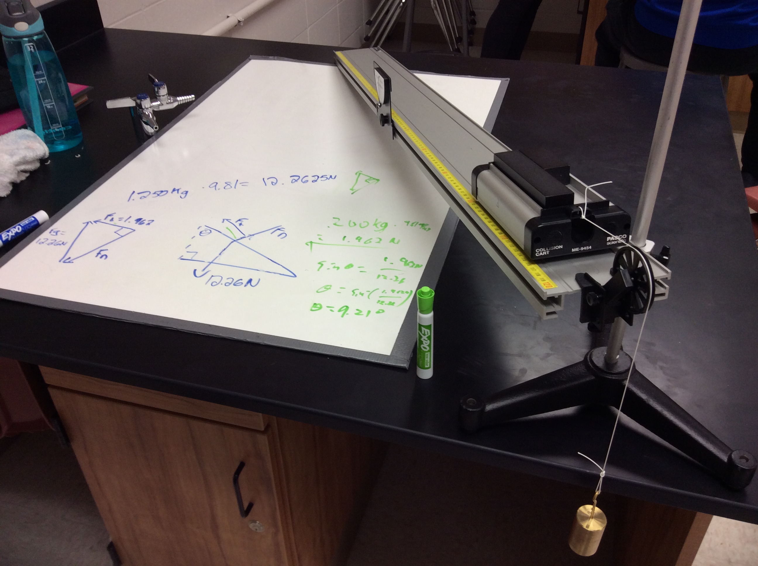 Each lab group got a cart mass and a hanging mass, then had to figure out what angle they should set their ramp to in order to balance the forces. I wasn’t sure how into it students would get since the goal was, pretty literally, to make nothing happen, but there were still cheers when they let go and everything stayed put. My students are now convinced they can do these problems in a way that just getting the right answer doesn’t accomplish. In one period, several groups finished quickly, so I had those groups keep the same angle and cart mass, but add to their hanging mass and calculate how much time it should take for the cart to make it up the ramp. I didn’t set up the photogates, since I wasn’t sure how many groups would get through this part, but students were able to get within 0.2 seconds of their prediction using a stopwatch.