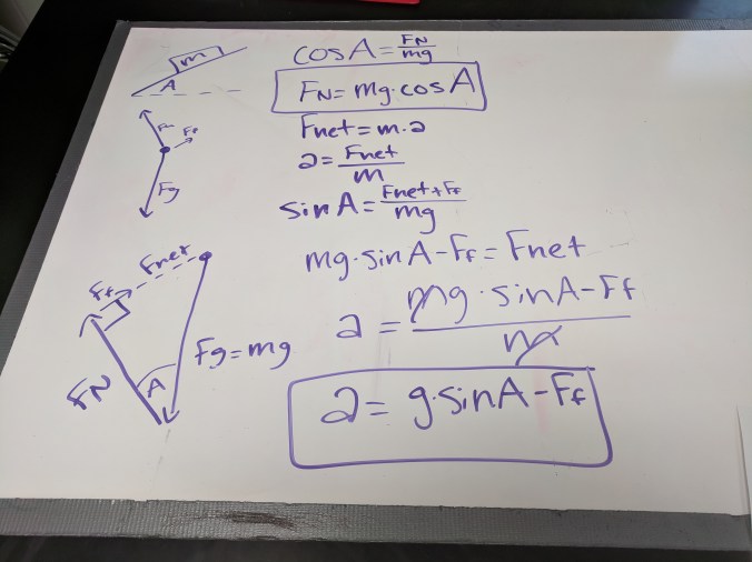 Students whiteboarded their results from a Pivot Interactives activity on Coulomb’s Law. There was some debate over whether inverse or inverse-square was the right linearization; I usually don’t have students sketch their points on their whiteboards, but I think that would have been helpful today. Students did a nice job connecting their results to Newton’s Laws and their knowledge from chemistry.